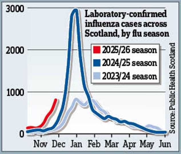 Now GPs are seeing an ‘unusually early flu surge across the health system’ with official data showing the number of laboratory-confirmed cases north of the Border soared from 555 to 805 in the week ending November 23 - a level not normally seen at this time of year