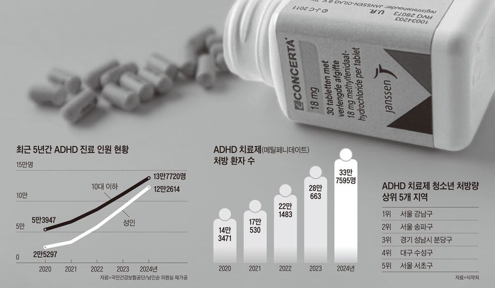 Supplies resumed in the second half of this year, but demand remains high, risking future shortages. Concerta, a stronger stimulant than caffeine, improves focus and regulates impulsivity in ADHD patients. However, its effects led to misconceptions as a ‘study aid.’ The Ministry of Food and Drug Safety found that regions with high educational fervor, such as Gangnam, Seocho, and Songpa in Seoul, had high ADHD medication prescriptions among teenagers, suggesting misuse for artificial focus.