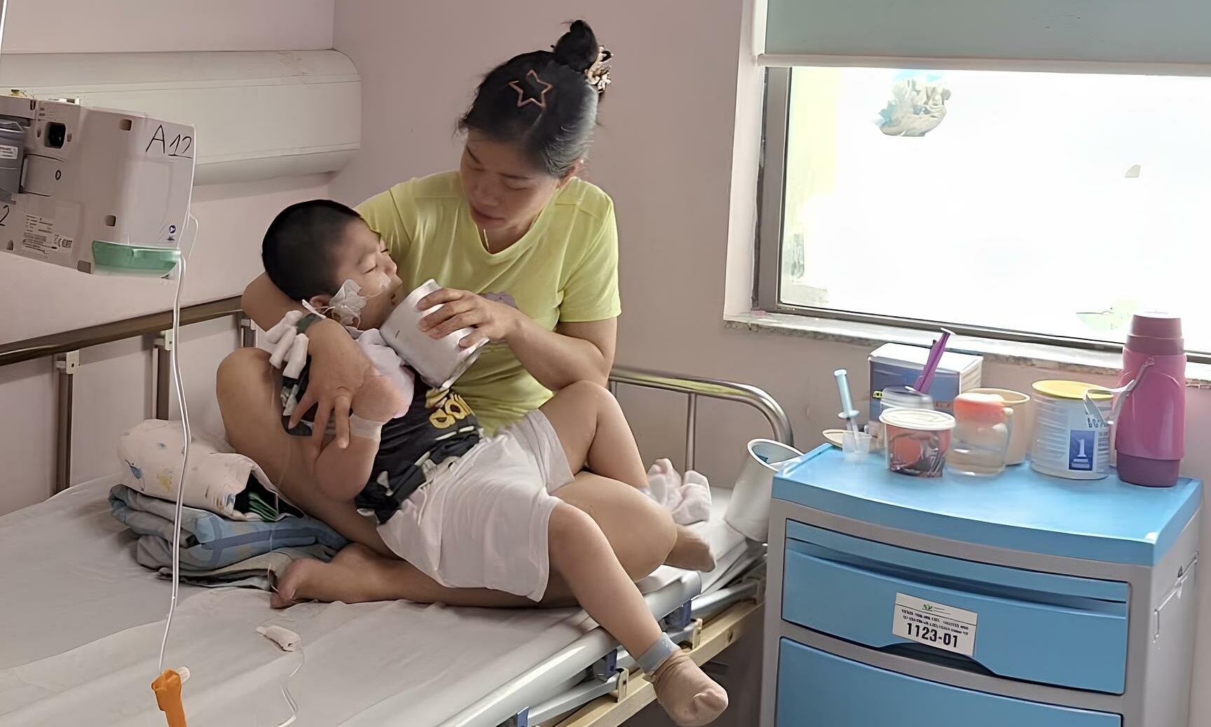 | Nguyen Thi Ca holds her son to help him deal with coughing and reflux. Photo by Bao Nhien |